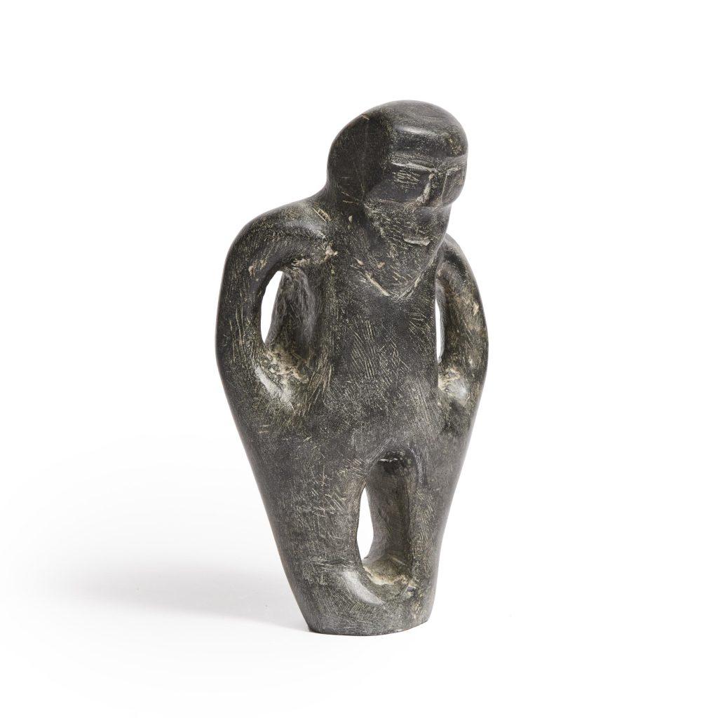 Several of the sculptures in the spring 2024 auction come to us from an important private collection in Charlottesville, Virginia. The pieces were carefully chosen, bought from sources including Waddington’s over a period of 19 years, primarily from 1979-1998, and have been held in the same collection ever since. Jarvis says of the collection, “the breadth and quality of works chosen is really quite notable. In a period when international interest in Inuit art was in its early stages, they put together a collection, not just of works by important artists, but also really superlative and interesting examples.” Among them is lot 158, John Tiktak’s Man with Hands in Pockets, circa 1970. This expressive figure exhibits one of the artist’s most recognizable stylistic devices: the arms defined in loops of stone, separated from the torso by oval-shaped excavated areas. The subject’s compressed eyes and slight smile is almost evocative of the peaceful faces of Tiktak’s Arviat contemporary John Pangnark.
